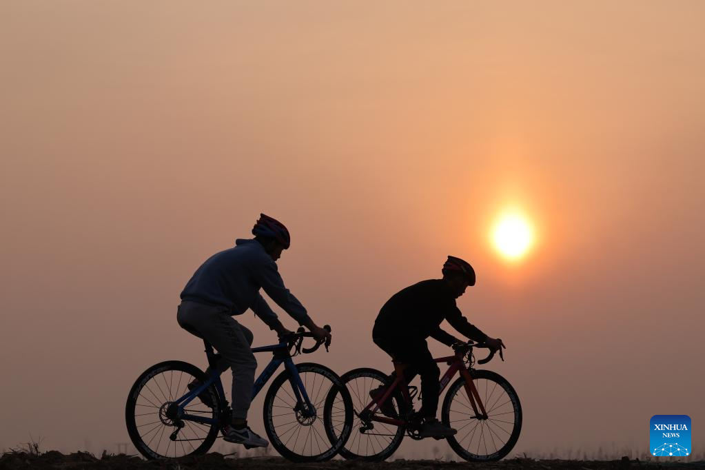 People ride bicycles at sunrise in Pingxiang County of Xingtai, north China's Hebei Province, Jan. 1, 2023. (Photo by Chai Gengli/Xinhua)