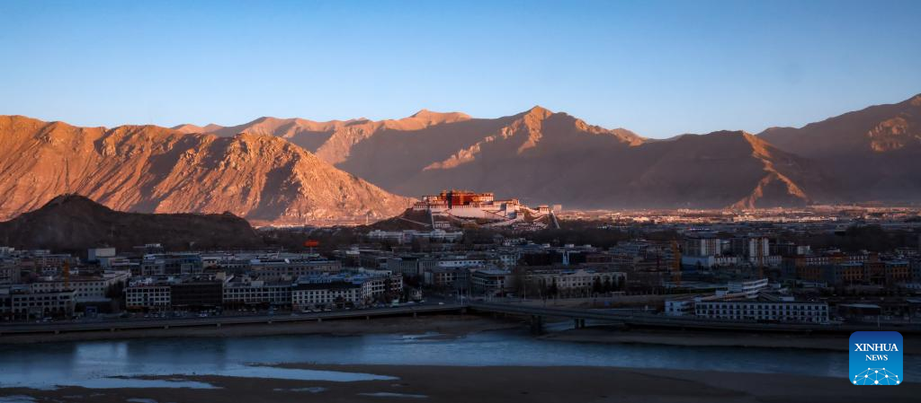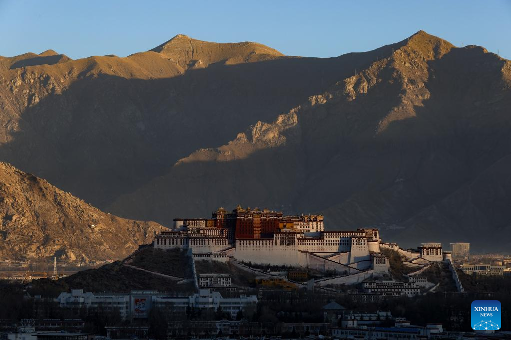 This photo taken on Jan. 1, 2023 shows the Potala Palace at sunrise in Lhasa, southwest China's Tibet Autonomous Region. (Xinhua/Jiang Fan)