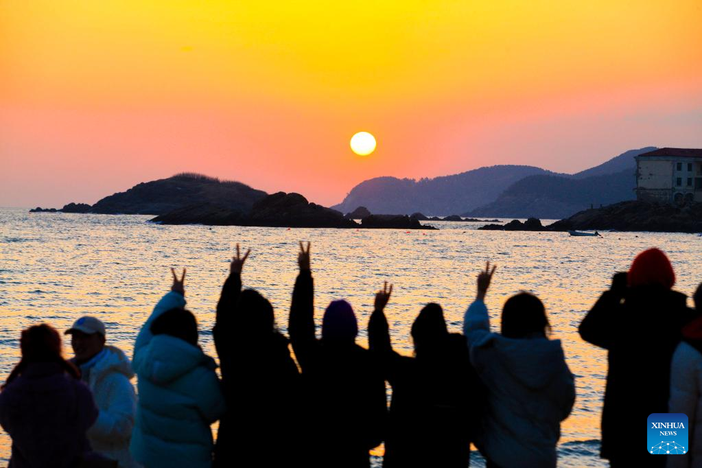 Tourists watch the sunrise on a beach in Weihai, east China's Shandong Province, Jan. 1, 2023. (Photo by Zhu Chunxiao/Xinhua)