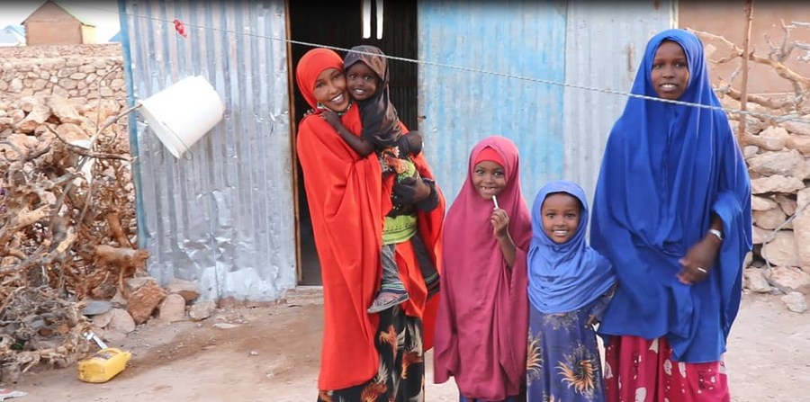 This photo shows Haawo Mohamud Farah (1st L), a tricycle (Tuktuk) taxi driver, posing for a photo with her family members at Cadado town, Somalia, Dec. 23, 2022. (Photo by Adbi/Xinhua)