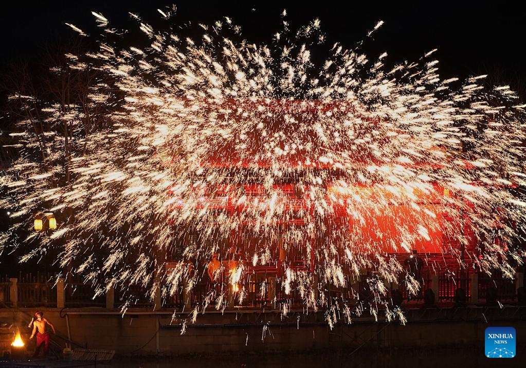 Staff members stage a molten iron fireworks performance at a movie-themed town in Zhongmu County of Zhengzhou, central China's Henan Province, Dec. 31, 2022. (Xinhua/Li An)
