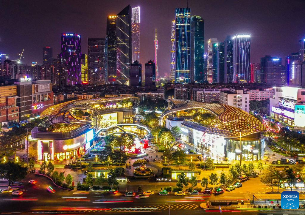 This aerial photo taken on Jan. 1, 2023 shows the night view of the Tianhe Road area in Guangzhou, south China's Guangdong Province. People take part in various leisure activities to spend the New Year holiday here. (Xinhua/Liu Dawei)