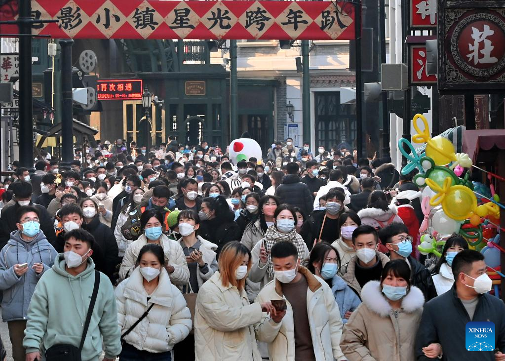 Tourists visit a movie-themed town during the New Year holiday in Zhongmu County of Zhengzhou, central China's Henan Province, Dec. 31, 2022. (Xinhua/Li An)