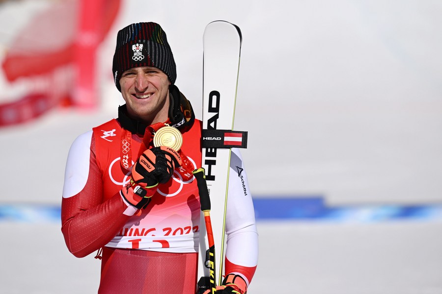 Matthias Mayer of Autsria poses during the awards ceremony of the Beijing 2022 Alpine Skiing Men's Super-G at National Alpine Skiing Centre in Yanqing District, Feb. 8, 2022. (Xinhua/Chen Bin)