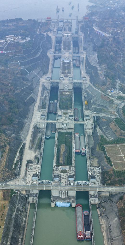 This aerial photo taken on Jan. 2, 2023 shows ships passing through the five-tier ship locks of the Three Gorges Dam in Yichang, central China's Hubei Province. (Photo by Wang Gang/Xinhua)