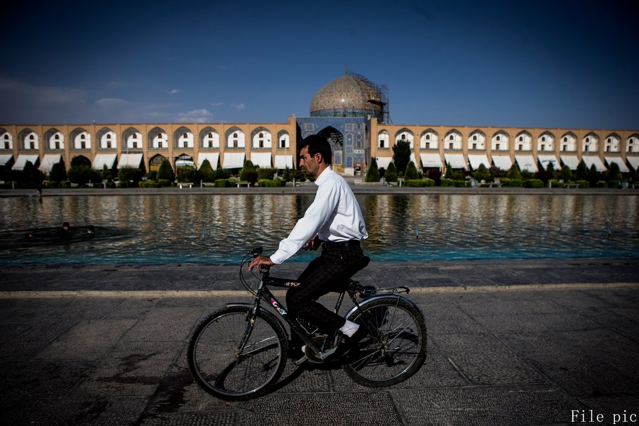 A man rides a bike on Naghshe Jahan Square in Isfahan, Iran, on July 17, 2019. (Xinhua/Ahmad Halabisaz)