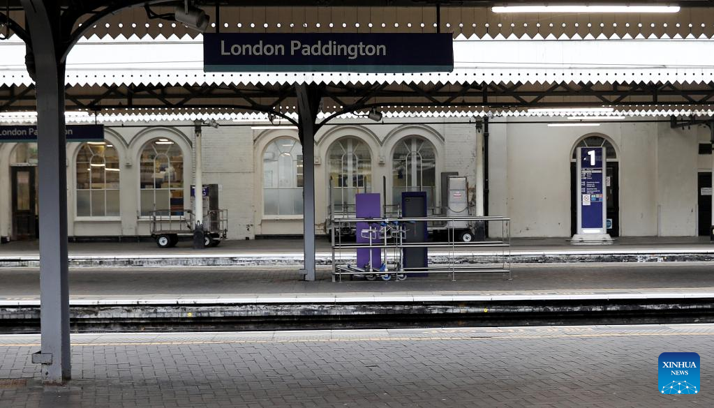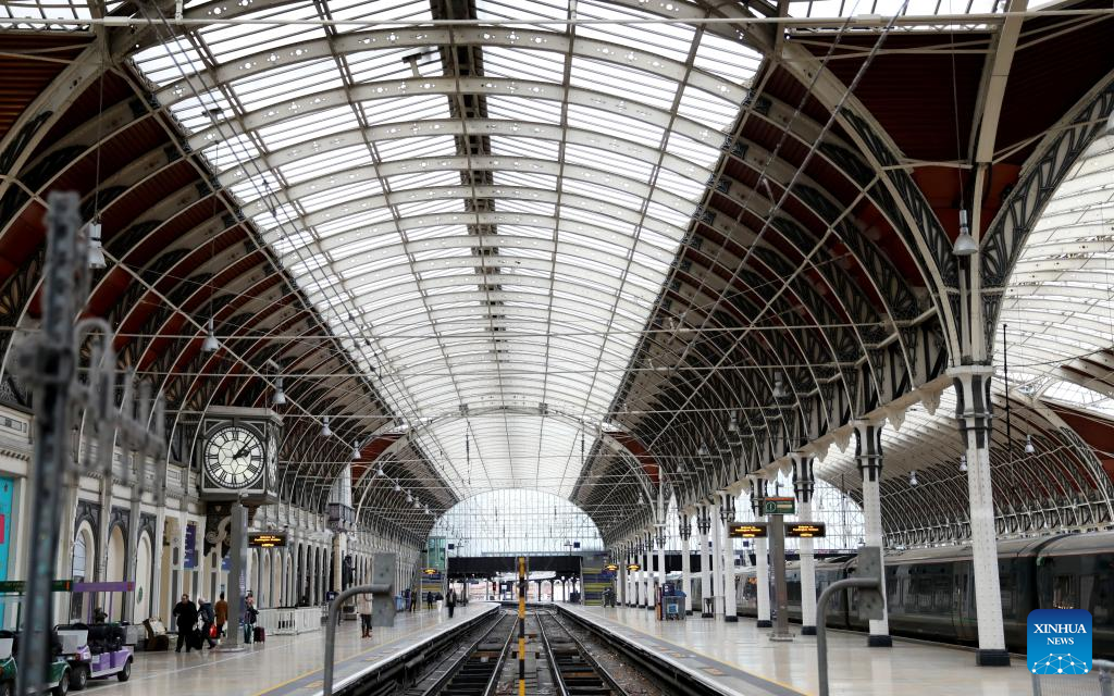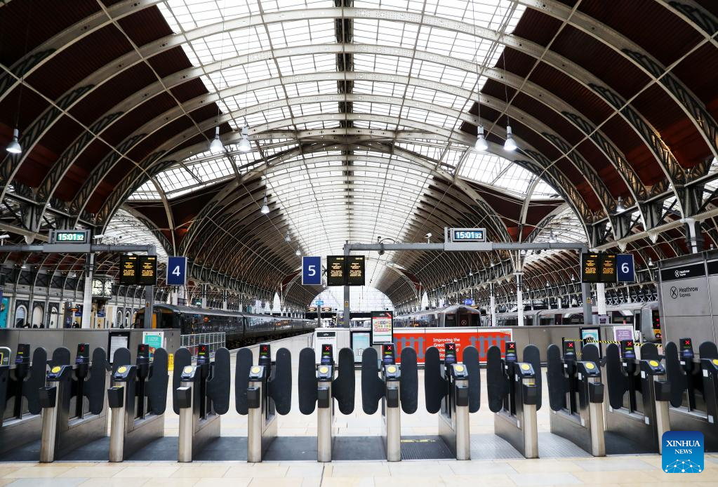 This photo taken on Jan. 5, 2023 shows a view of Paddington Station in London, Britain, as rail workers continue a strike over pay and terms. The first week of 2023 is marked by further strikes as workers of the Rail, Maritime and Transport union began their two 48-hour strikes from Tuesday and Friday and the train employees' union Aslef has called strike for Thursday. (Xinhua/Li Ying)