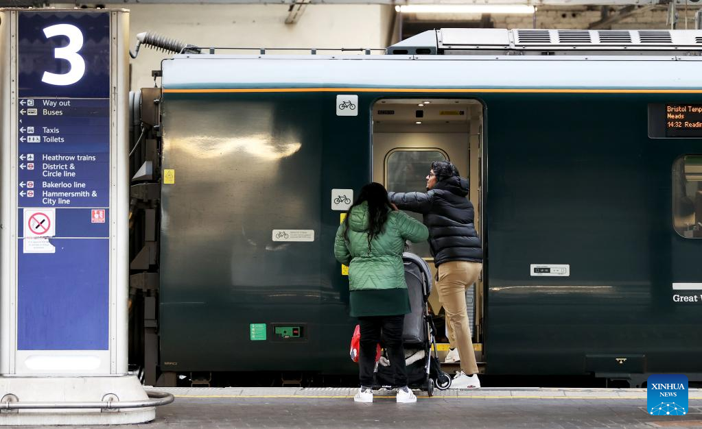 Passengers board a train at Paddington Station in London, Britain, as rail workers continue a strike over pay and terms, on Jan. 5, 2023. The first week of 2023 is marked by further strikes as workers of the Rail, Maritime and Transport union began their two 48-hour strikes from Tuesday and Friday and the train employees' union Aslef has called strike for Thursday. (Xinhua/Li Ying)