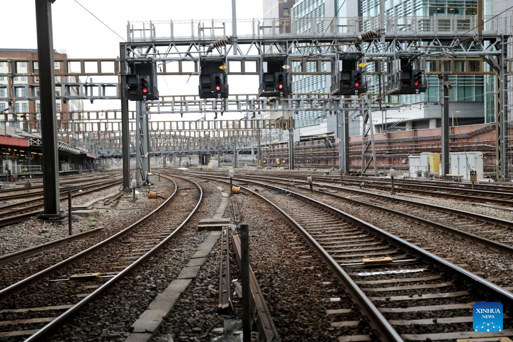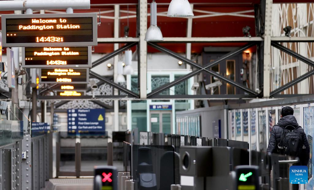 A man walks at Paddington Station in London, Britain, as rail workers continue a strike over pay and terms, on Jan. 5, 2023. The first week of 2023 is marked by further strikes as workers of the Rail, Maritime and Transport union began their two 48-hour strikes from Tuesday and Friday and the train employees' union Aslef has called strike for Thursday. (Xinhua/Li Ying)