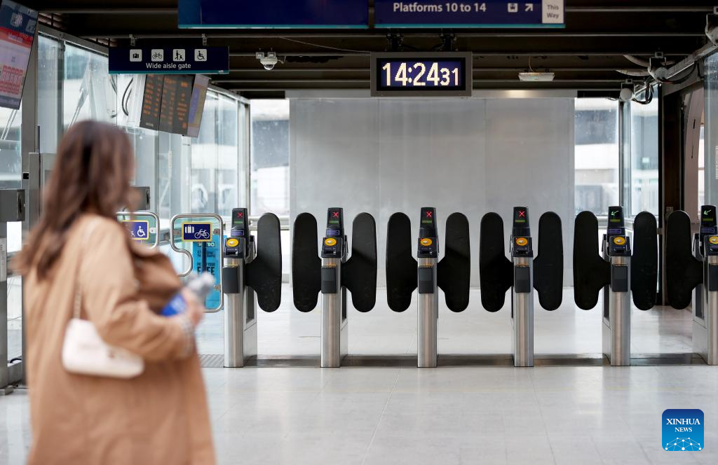 Closed ticket gates are seen at Paddington Station in London, Britain, as rail workers continue a strike over pay and terms, on Jan. 5, 2023. The first week of 2023 is marked by further strikes as workers of the Rail, Maritime and Transport union began their two 48-hour strikes from Tuesday and Friday and the train employees' union Aslef has called strike for Thursday. (Xinhua/Li Ying)