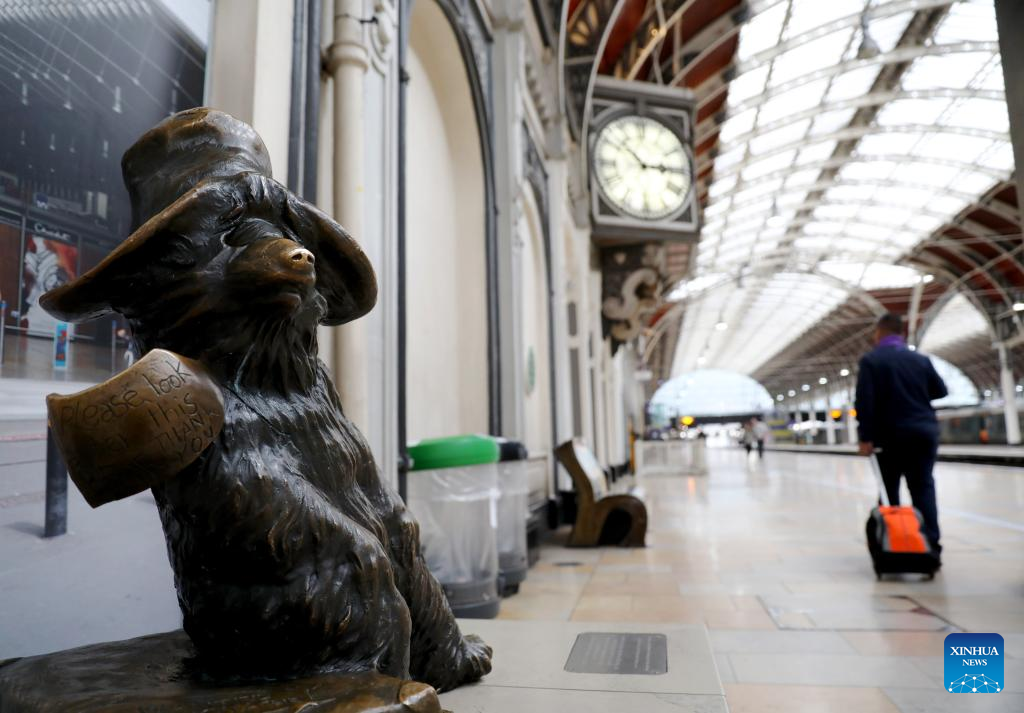 A passenger walks past a statue of "Paddington Bear" in Paddington Station in London, Britain, as rail workers continue a strike over pay and terms, on Jan. 5, 2023. The first week of 2023 is marked by further strikes as workers of the Rail, Maritime and Transport union began their two 48-hour strikes from Tuesday and Friday and the train employees' union Aslef has called strike for Thursday. (Xinhua/Li Ying)