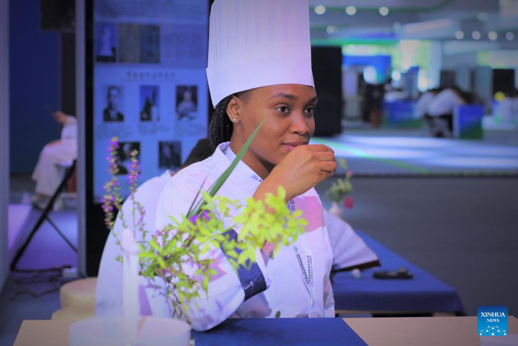 Nelcy Espirito Santo shows the art of tea during the World Vocational College Skills Competition in Tianjin, north China, Aug. 19, 2022. (Xinhua)