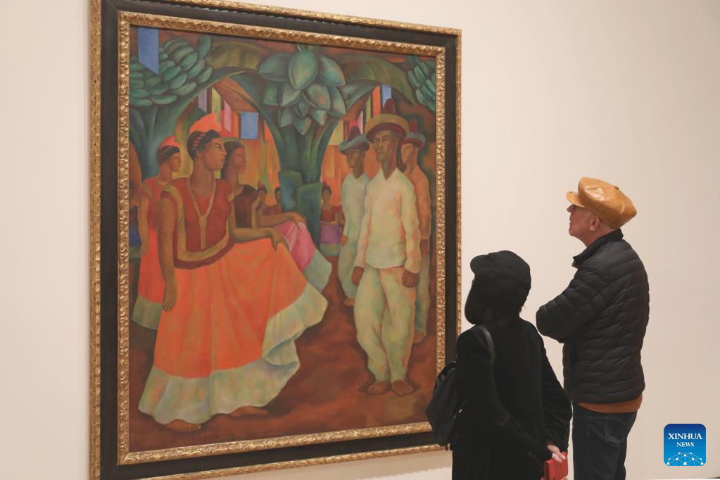 People watch an artwork by Diego Rivera during an exhibition named "Diego Rivera's America" at San Francisco Museum of Modern Art in San Francisco, the United States, Jan. 3, 2023. The exhibition, opened on July 16 of 2022, was closed on Tuesday. (Photo by Liu Yilin/Xinhua)