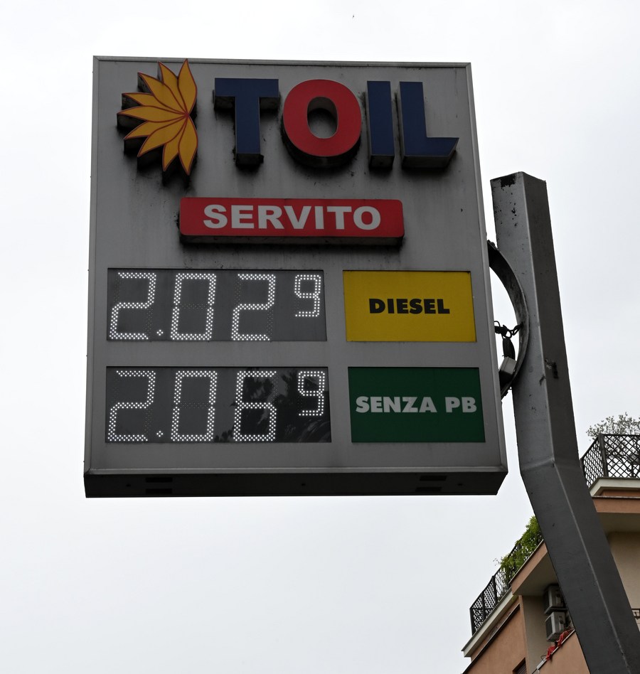 Gasoline and diesel prices are displayed near a gas station in Rome, Italy, June 23, 2022. (Photo by Alberto Lingria/Xinhua)
