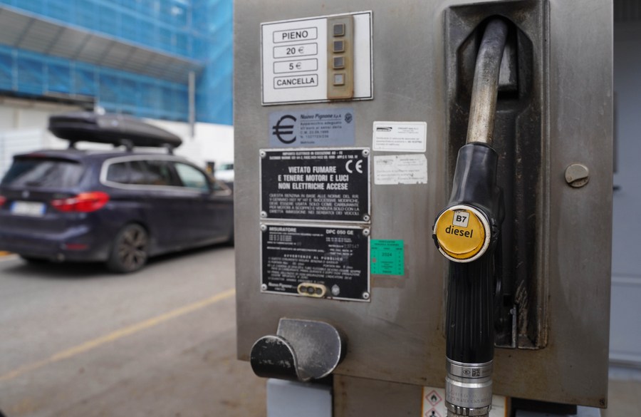 A fuel gun is seen at a self-service gas station in Rome, Italy, April 2, 2022. (Xinhua/Jin Mamengni)