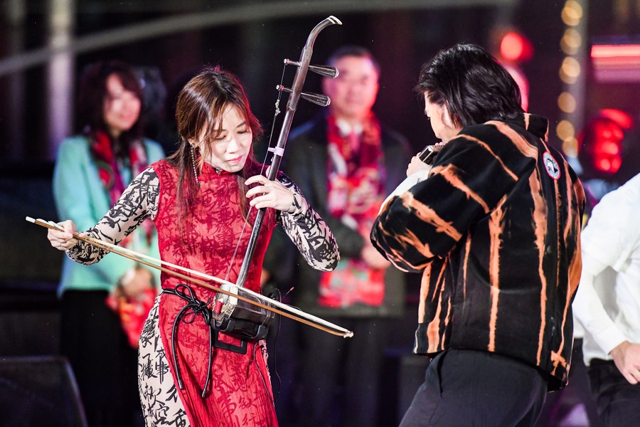 An artist from China's Hong Kong Special Administrative Region plays Chinese musical instrument Erhu during the Times Square New Year's Eve celebration in Manhattan, New York, the United States, Dec. 31, 2022. (Photo by Ziyu Julian Zhu/Xinhua)