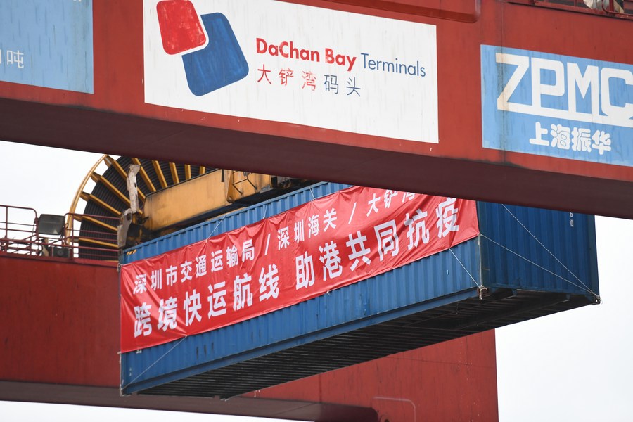 A container carrying supplies for Hong Kong is loaded onto a ship at Dachanwan wharf of Shenzhen port, south China's Guangdong Province, Feb. 21, 2022. (Xinhua/Liang Xu)