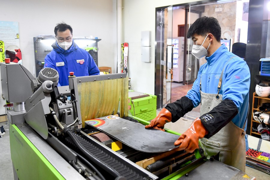 The frequent use of snowboards wears them down, adding pressure on Yu Chunsheng, a repairman for ski equipment. "I used to do car assembly and maintenance, then I was introduced via a friend to work at the ski resort. And the pay is good," said Yu.