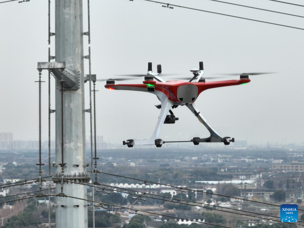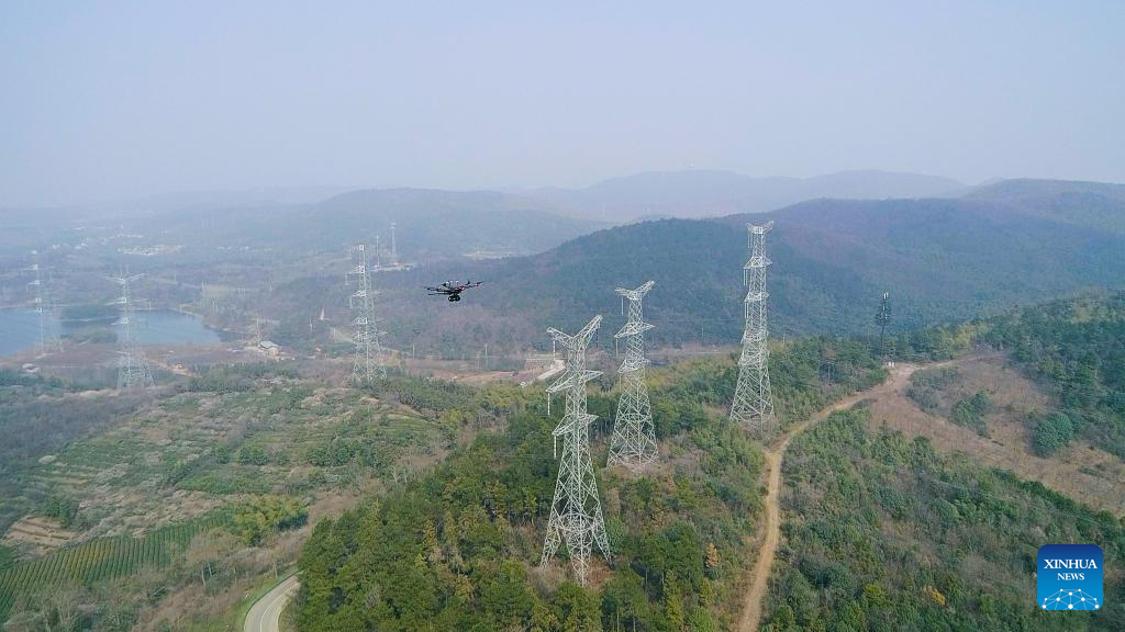 An unmanned drone with centimeter-level high-precision positioning capabilities inspects the automatic transmission lines of the electric transmission towers in east China's Jiangsu Province, Jan. 4, 2023. China has successfully developed its first holographic digital power grid in Jiangsu. It is expected to greatly improve the smart operations and inspections of the grid, according to the State Grid Corporation of China (State Grid). (State Grid Jiangsu Electric Power Co., Ltd./Handout via Xinhua)