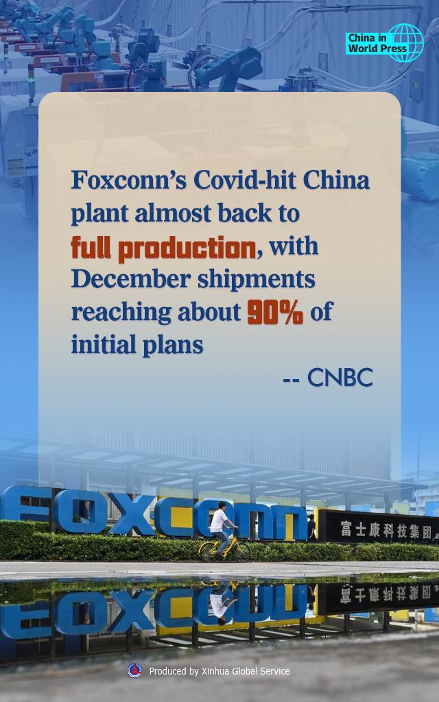 Foxconn's Covid-hit iPhone plant in China's Zhengzhou city is almost back to full production, with its December shipments reaching about 90% of initial plans, the CNBC reported, citing two people with direct knowledge of the matter.
