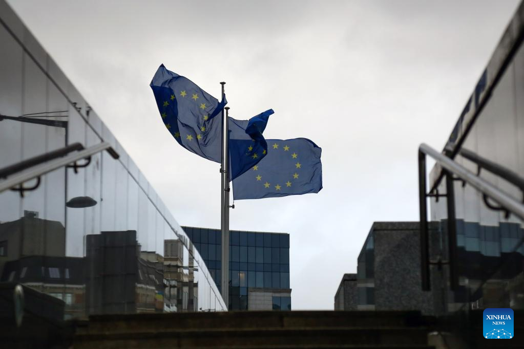 EU flags are seen outside the European Commission in Brussels, Belgium, Jan. 6, 2023. Inflation in the eurozone is expected to have dropped for a second consecutive month in December 2022 to 9.2 percent year-on-year, according to preliminary data published by Eurostat, the statistical office of the European Union (EU), on Friday. (Xinhua/Zheng Huansong)