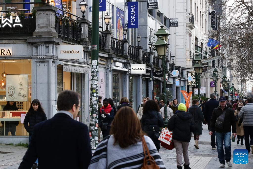 Pedestrians walk on a business street in Brussels, Belgium, Jan. 3, 2023. Inflation in the eurozone is expected to have dropped for a second consecutive month in December 2022 to 9.2 percent year-on-year, according to preliminary data published by Eurostat, the statistical office of the European Union (EU), on Friday. (Xinhua/Zheng Huansong)