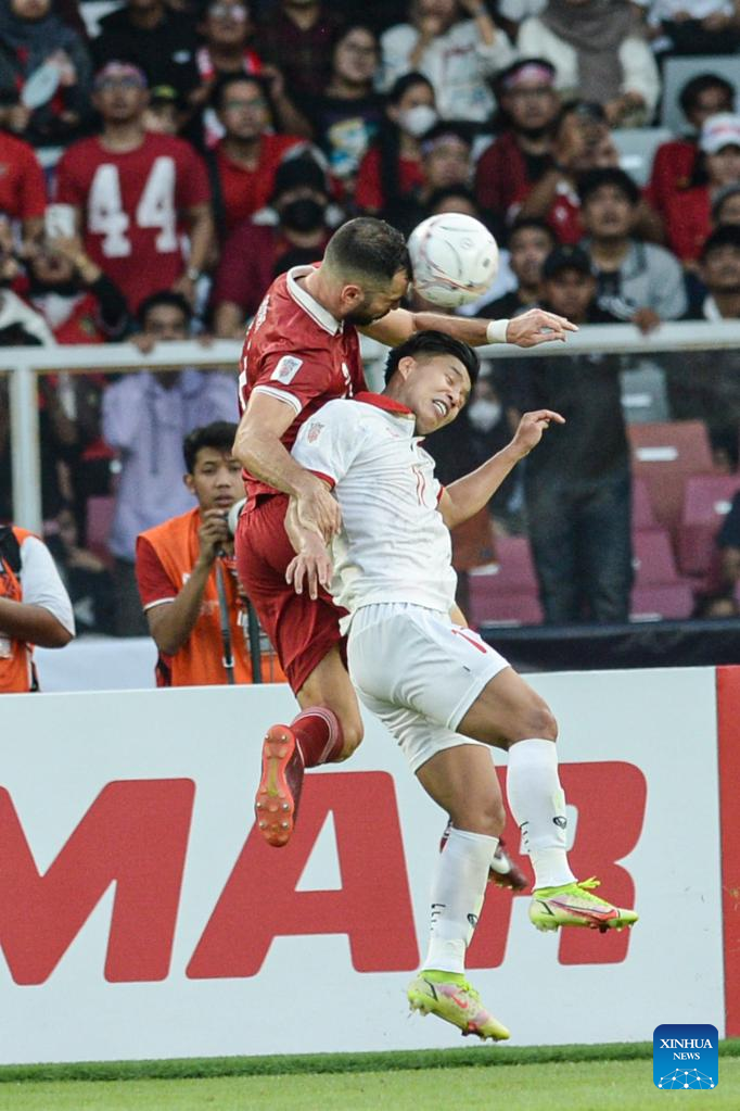 Jordi Amat Maas (L) of Indonesia vies with Nguyen Tuan Aanh of Vietnam during the ASEAN Football Federation (AFF) Mitsubishi Electric Cup 2022 semifinal 1st leg match between Indonesia and Vietnam at Gelora Bung Karno Stadium in Jakarta, Indonesia, Jan. 6, 2023. (Xinhua/Agung Kuncahya B.)