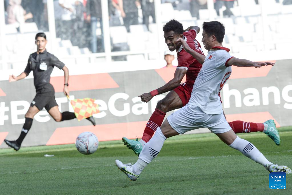 Rahmat Irianto (R) of Indonesia competes with Phan Van Duc of Vietnam during the ASEAN Football Federation (AFF) Mitsubishi Electric Cup 2022 semifinal 1st leg match between Indonesia and Vietnam at Gelora Bung Karno Stadium in Jakarta, Indonesia, Jan. 6, 2023. (Xinhua/Agung Kuncahya B.)