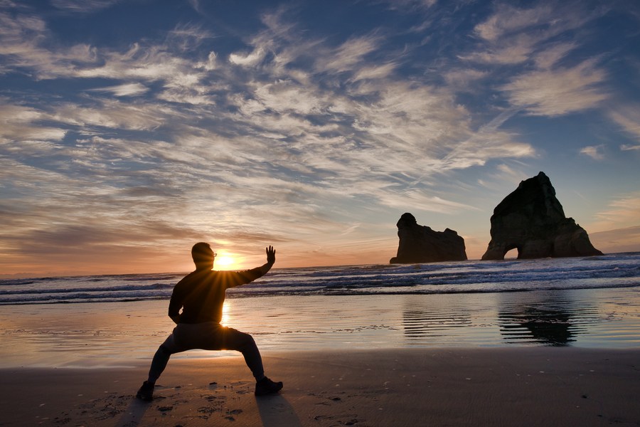 A visitor practises Chinese martial arts at the Wharariki Beach of the Golden Bay tourist site in New Zealand, May 23, 2021. (Photo by Zhang Jianyong/Xinhua)