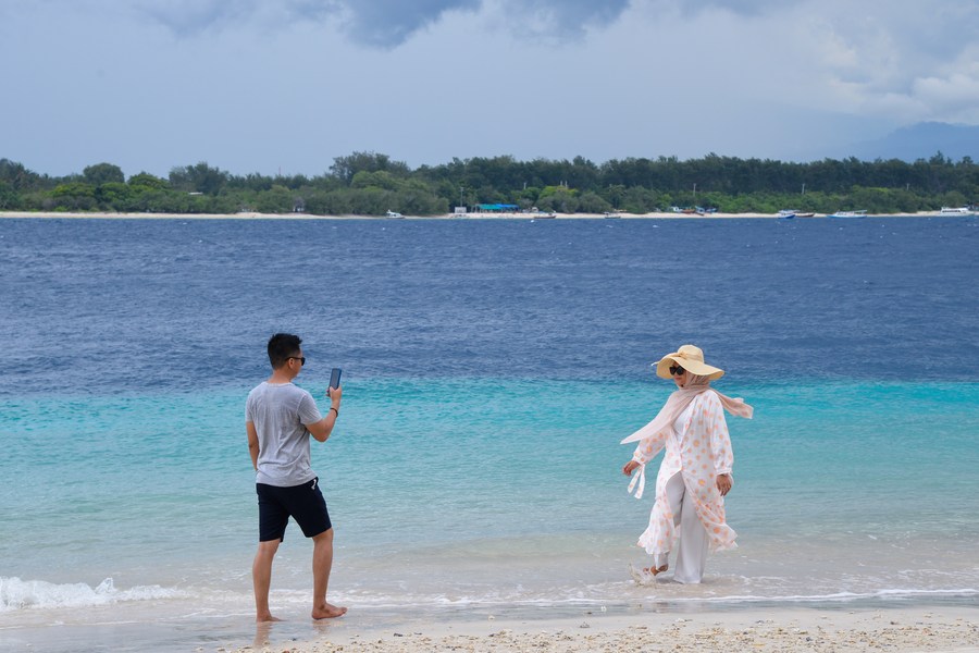 Tourists take photos on the beach of Gili Trawangan, one of the three Gili islands in Lombok, Indonesia on March 18, 2022. (Xinhua/Xu Qin)