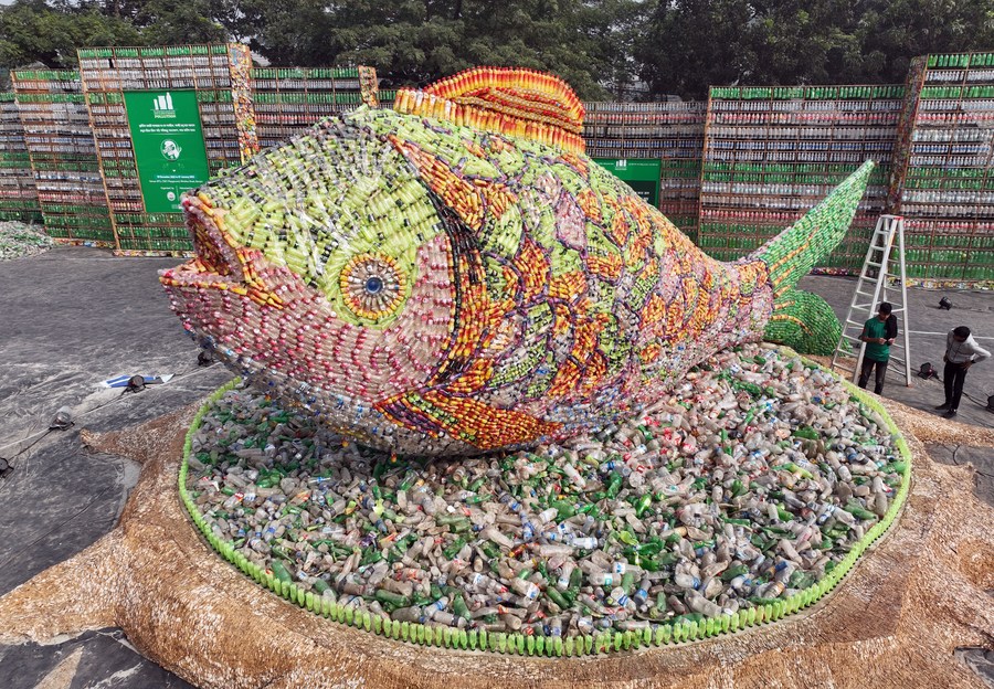 Photo taken on Jan. 5, 2023, shows a fish-shaped installation made of empty plastic bottles and cigarette filters at an exhibition in Dhaka, Bangladesh. (Xinhua)