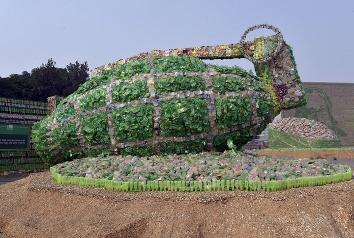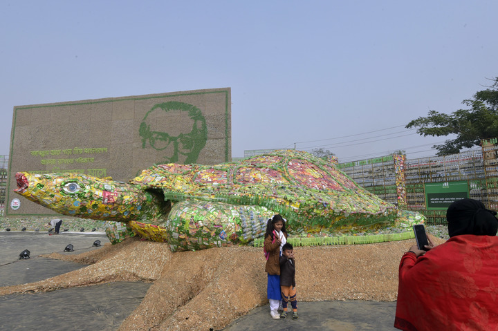 An exhibition has been arranged by the organization in capital Dhaka to create public awareness of pollution, with empty plastic bottles and cigarette filters being collected to shape into special artworks on school premises.