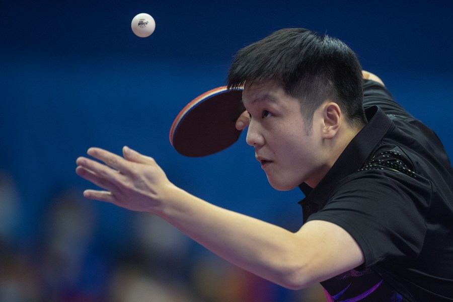 Fan Zhendong of Shanghai serves during the men's team semifinal match against Wei Shihao of Heilongjiang at the 2022 Chinese National Table Tennis Championships in Huangshi, central China's Hubei Province, Nov. 5, 2022. (Xinhua/Xiao Yijiu)