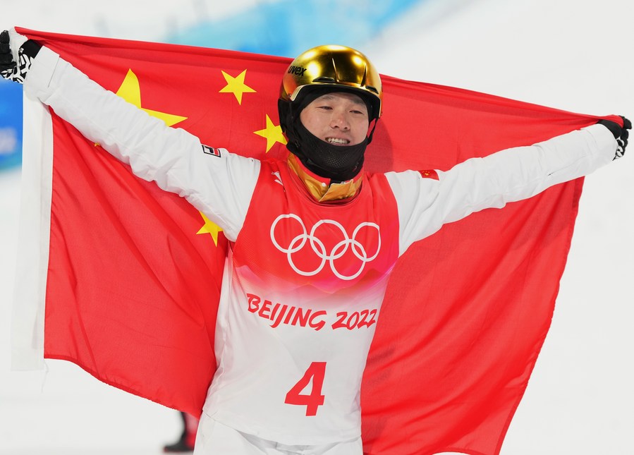 Qi Guangpu of China celebrates after winning the freestyle skiing men's aerials final of Beijing 2022 Winter Olympics at Genting Snow Park in Zhangjiakou, north China's Hebei Province, Feb. 16, 2022. (Xinhua/Yang Shiyao)