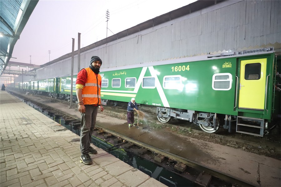 A staff member at Lahore station of Pakistan Railways stands in front of train coaches imported from China in Pakistan's eastern city of Lahore on Jan. 5, 2023. (Xinhua/Jiang Chao)