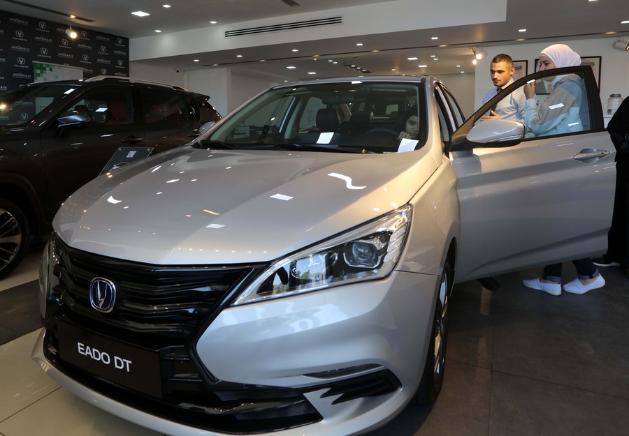 People view a vehicle made by Chinese automaker Changan at a showroom in Amman, Jordan, on Aug. 15, 2022. Chinese new energy vehicle (NEV) brands are becoming increasingly popular in Jordanian vehicle markets, because of their advantages such as cost-effective, trend-setting car design, and cutting-edge technology in electric power, which contribute to a greener future that Jordan is seeking. (Photo by Mohammad Abu Ghosh/Xinhua)
