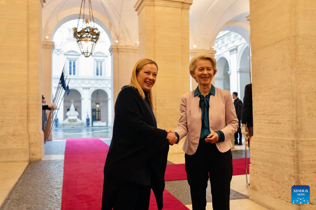 ROME, Jan. 9 (Xinhua) -- Italian Prime Minister Giorgia Meloni and European Commission President Ursula von der Leyen discussed the challenges of economic growth and European migration policy here on Monday.