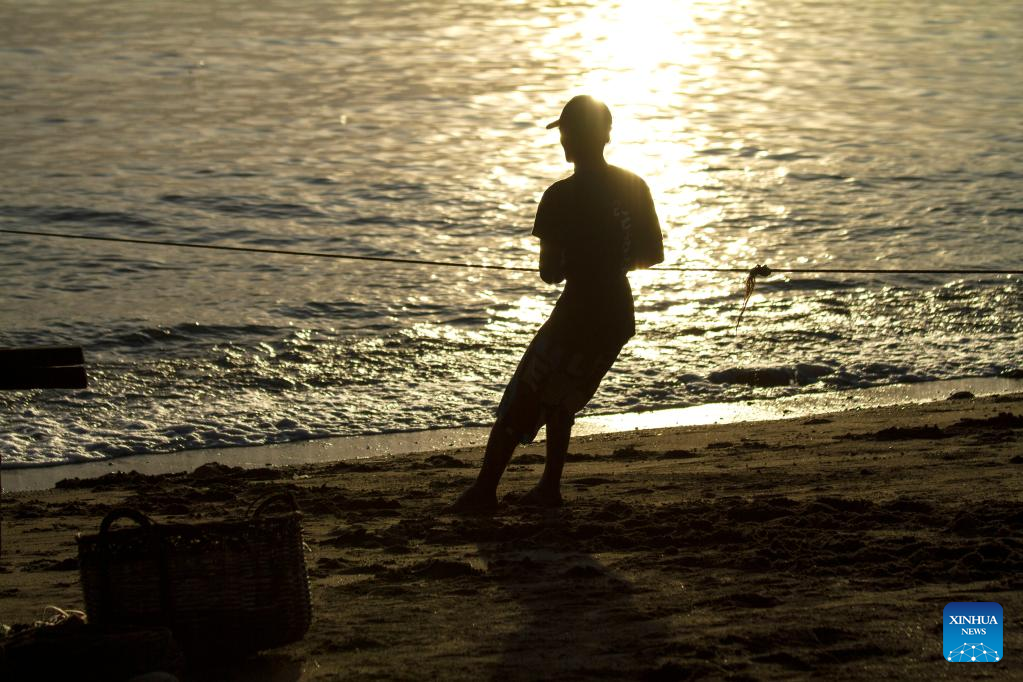 A fisherman pulls a fishing net at sunrise at Pusong Baru beach in Lhokseumawe, Aceh Province, Indonesia, Jan. 9, 2023. (Photo by Fachrul Reza/Xinhua)