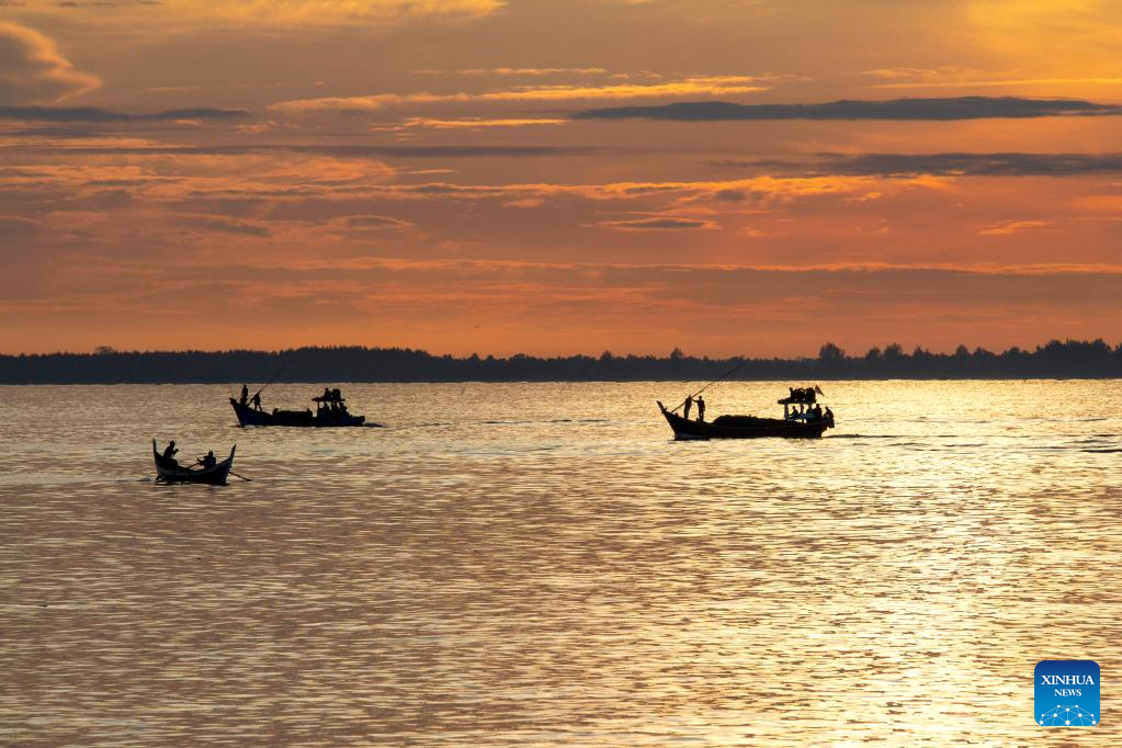 Fishermen catch fish at sunrise at Pusong Baru beach in Lhokseumawe, Aceh Province, Indonesia, Jan. 9, 2023. (Photo by Fachrul Reza/Xinhua)