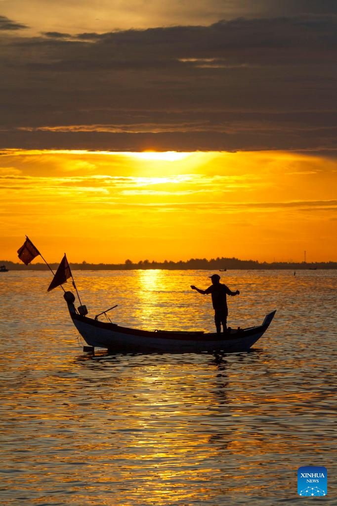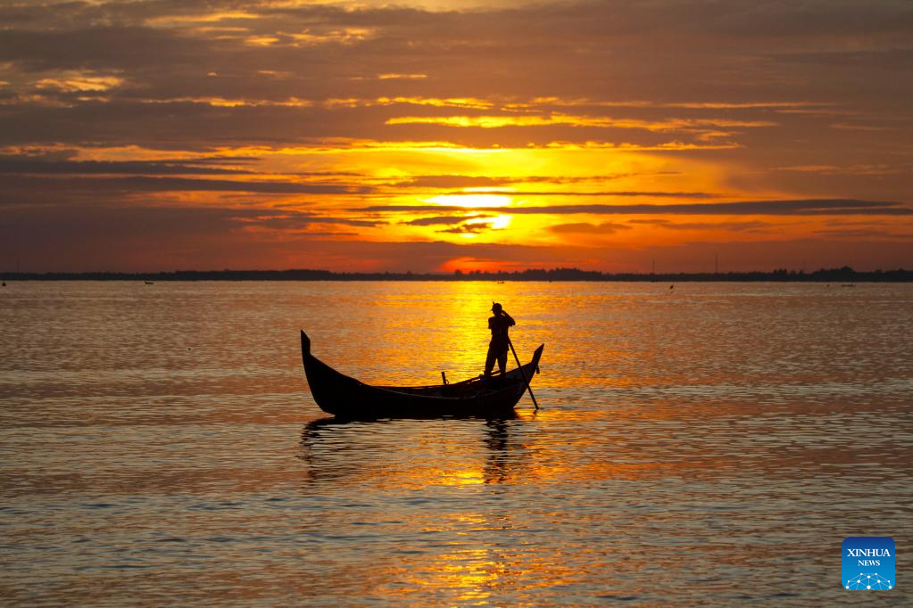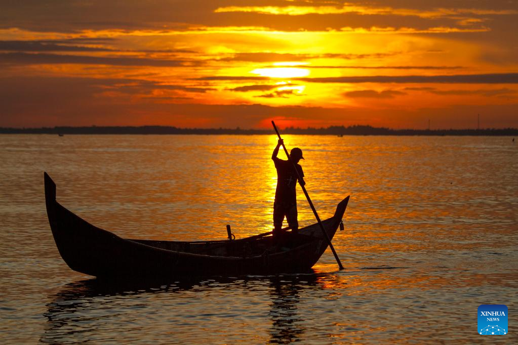 A fisherman rows a fishing canoe at sunrise at Pusong Baru beach in Lhokseumawe, Aceh Province, Indonesia, Jan. 9, 2023. (Photo by Fachrul Reza/Xinhua)