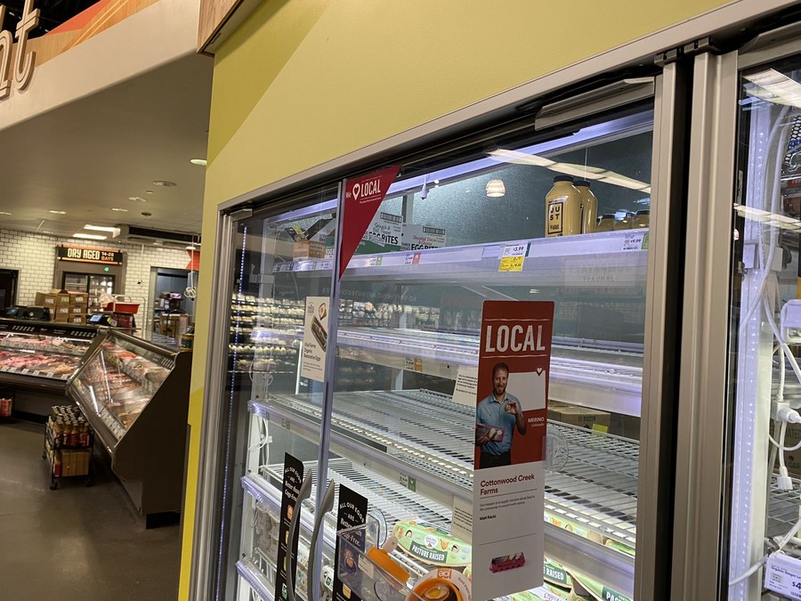 Photo taken on Jan. 10, 2023 shows that shelves of a grocery store are bare of eggs in Westminster, Colorado, the United States. (Photo by Peter Mertz/Xinhua)