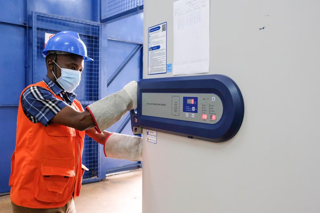 An employee locks an ultra-low temperature freezer containing Ebola trial vaccines at National Medical Stores in Entebbe, Uganda, Dec. 8, 2022. (Photo by Hajarah Nalwadda/Xinhua)