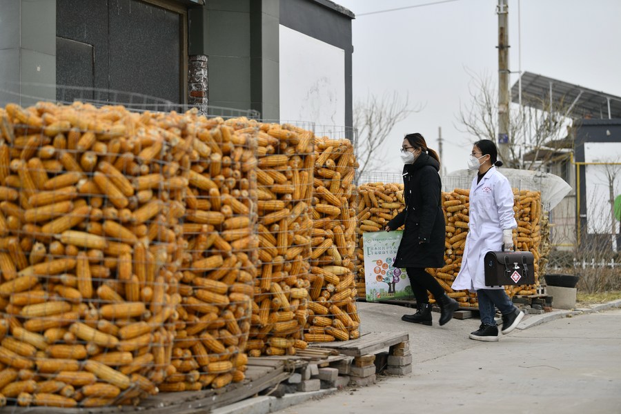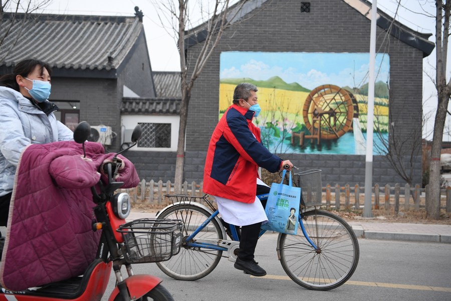 Doctor Sun Qingliang(R) goes for home visits in Wangdadiao Village, Fengnan District of Tangshan City, north China's Hebei Province, Jan. 11, 2023. (Xinhua/Mu Yu)
