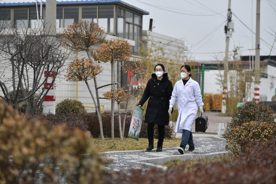 Doctor Dong Xiuqin (R) goes for home visits in Lingzishang Village, Fengnan District of Tangshan City, north China's Hebei Province, Jan. 11, 2023. (Xinhua/Mu Yu)