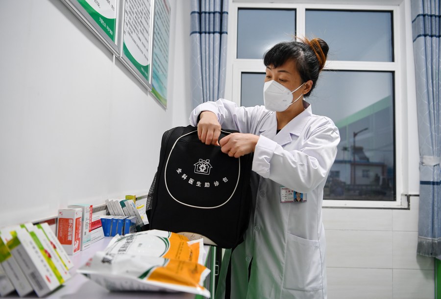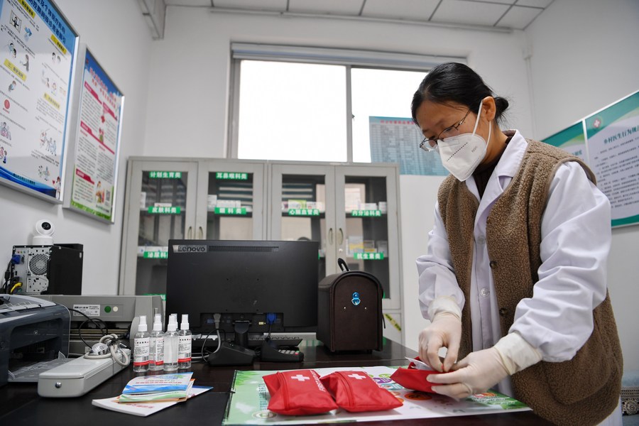 Doctor Dong Xiuqin prepares health kits for home visits at a village clinic in Lingzishang Village, Fengnan District of Tangshan City, north China's Hebei Province, Jan. 11, 2023. (Xinhua/Mu Yu)