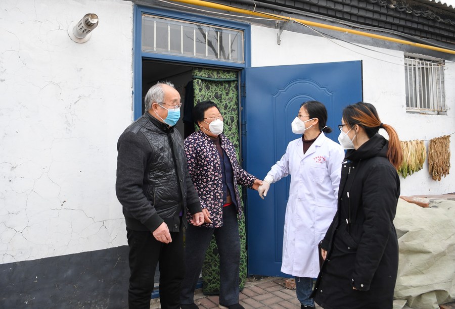 Doctor Dong Xiuqin (2nd R) talks with villagers during a home visit in Lingzishang Village, Fengnan District of Tangshan City, north China's Hebei Province, Jan. 11, 2023. (Xinhua/Mu Yu)