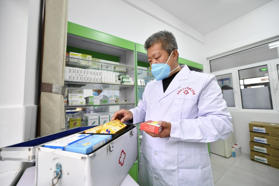 Doctor Sun Qingliang prepares medicines for home visits at a village clinic in Wangdadiao Village, Fengnan District of Tangshan City, north China's Hebei Province, Jan. 11, 2023. (Xinhua/Mu Yu)