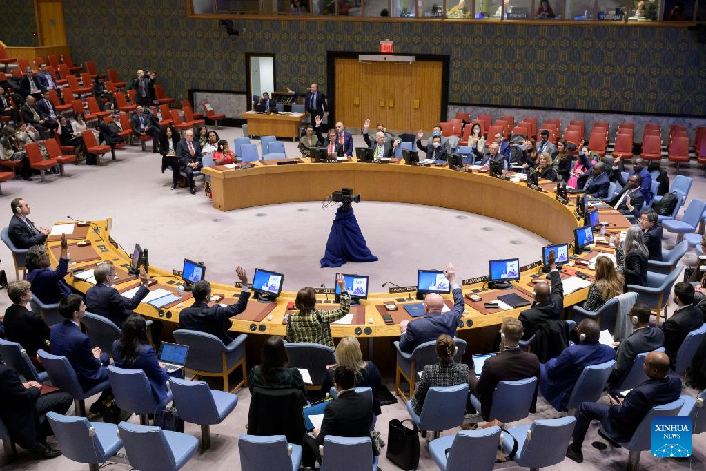 Representatives vote on a draft resolution during a UN Security Council meeting at the UN headquarters in New York, on Jan. 11, 2023. The Security Council on Wednesday adopted a resolution to expand the mandate of the UN Verification Mission in Colombia to include monitoring the implementation of the 2016 peace agreement's comprehensive rural reform and ethnic chapters. (Manuel Elias/UN Photo/Handout via Xinhua)