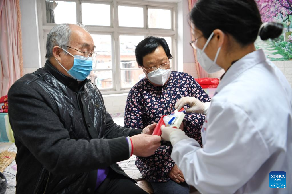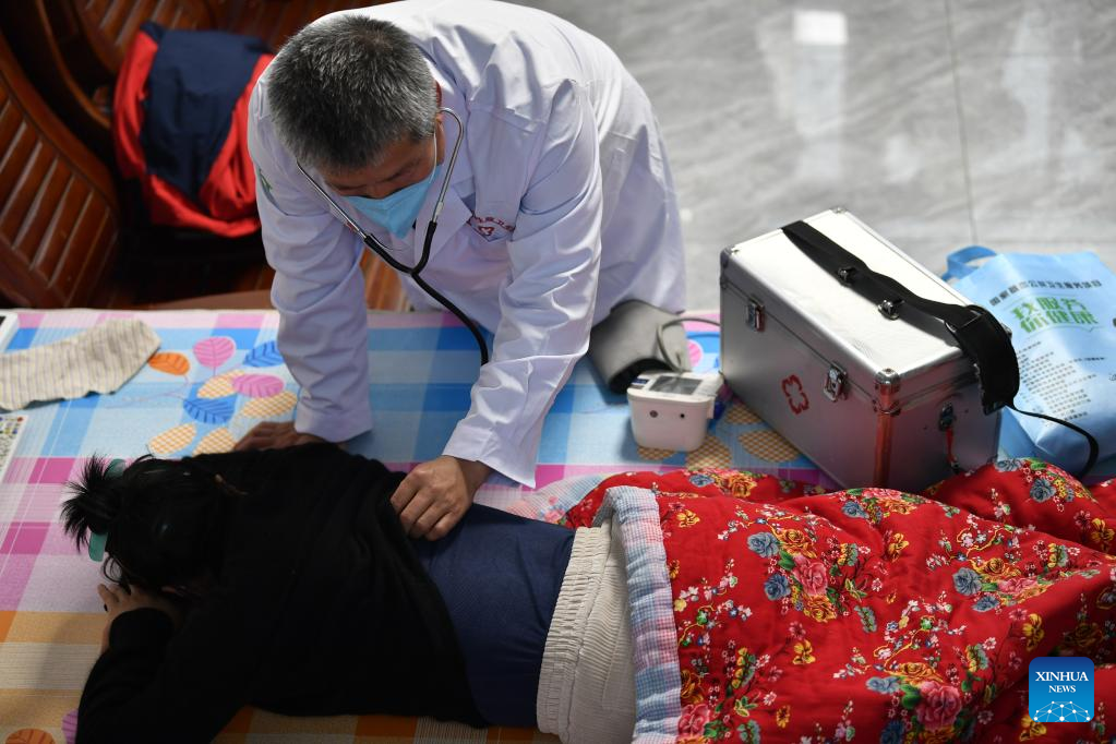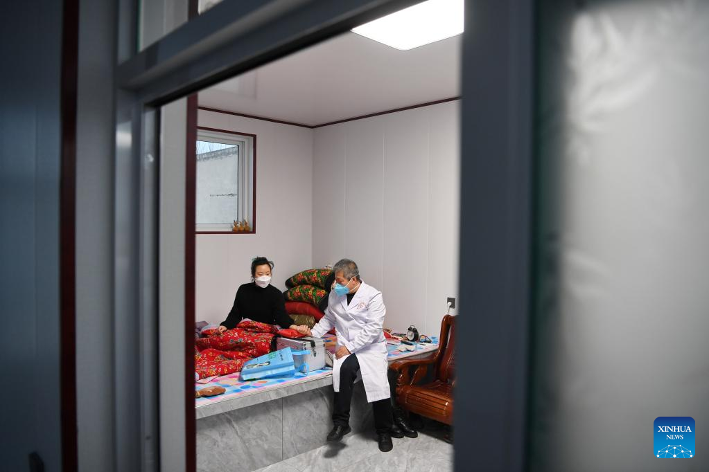 Doctor Sun Qingliang treats a patient at Wangdadiao Village, Fengnan District of Tangshan City, north China's Hebei Province, Jan. 11, 2023. As China now is entering a new phase of COVID response, Fengnan District has geared up to strengthen the roles of grassroots health facilities against the highly contagious virus. More than 500 health teams comprising over 1,100 medical personnel have been assembled to provide services for rural residents in the district. (Xinhua/Mu Yu)