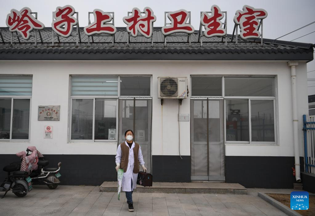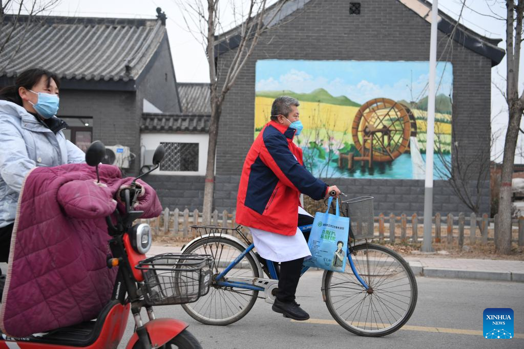 Doctor Dong Xiuqin leaves the village clinic for home visits in Lingzishang Village, Fengnan District of Tangshan City, north China's Hebei Province, Jan. 11, 2023. As China now is entering a new phase of COVID response, Fengnan District has geared up to strengthen the roles of grassroots health facilities against the highly contagious virus. More than 500 health teams comprising over 1,100 medical personnel have been assembled to provide services for rural residents in the district. (Xinhua/Mu Yu)